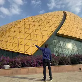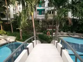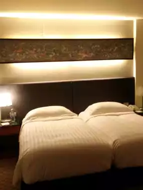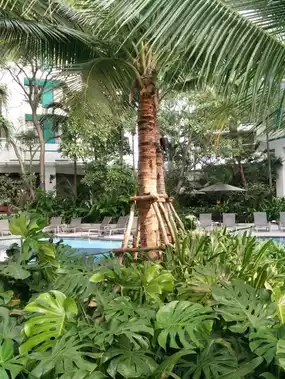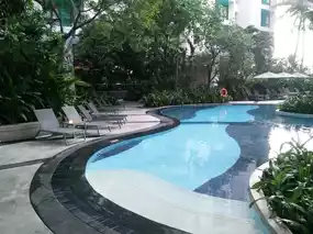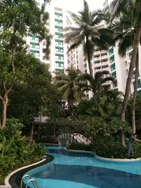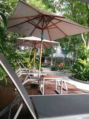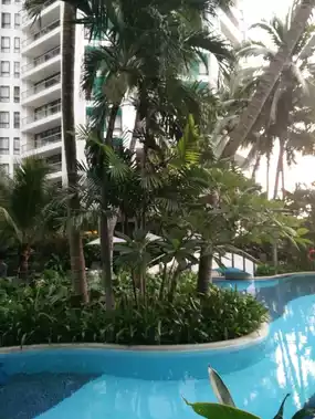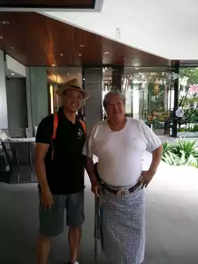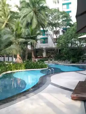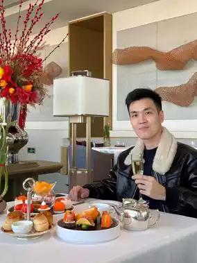 Chatrium Residence Sathon Bangkok is located in the heart of Bangkok. The hotel features a landscaped garden pool, fitness center, children's playground, free parking, and complimentary WiFi throughout the property. The spacious rooms include a bedroom, living and dining areas, and kitchen facilities. The garden pool on the second floor is beautifully serene, with a unique curved design unlike typical rectangular pools. Early in the morning, I took advantage of the quiet to swim and exercise. While waiting for breakfast downstairs, I suddenly noticed a large man in front of me. Upon closer inspection, I realized it was the famous Hong Kong martial arts star Sammo Hung. I approached him to say hello and asked for a photo, to which he gladly agreed. He was accompanied by his wife, actress Joyce Godenzi. It was incredibly lucky to meet such a big star and enjoy such a comfortable space and environment.