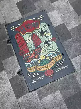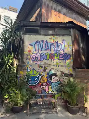 Talad Noi, located in the Charoen Krung area, is a charming old-style neighborhood with artistic touches and a Chinese community vibe. The alleys are filled with unique shops selling clothes, collectibles, and cozy cafes ☕️ offering drinks. There are also artistic photo spots featuring street art 🖼️ and delicious restaurants. If you're driving, parking might be challenging, so it's recommended to take the MRT Blue Line to Hua Lamphong station and then hop on a motorcycle taxi or tuk-tuk to get there.
