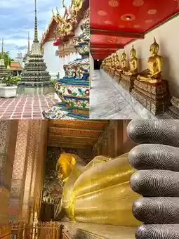 3) Wat Pho, the temple of King Rama I, has a large reclining Buddha, a large and beautiful reclining Buddha, a statue of a hermit doing stretching exercises, and various academic texts inscribed around the temple. It is the first university in Thailand.