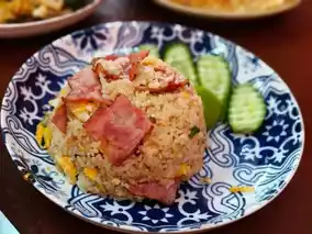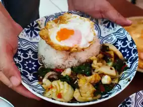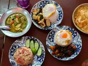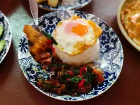 The restaurant offers a variety of recommended dishes, such as Stir-fried Squid with Holy Basil, Crispy Pork Kaprao, Green Curry with Braised Pork, Khun Chang's Traditional Shrimp Omelette, and Flavorful Bacon Fried Rice. The spicy and zesty Kaprao dishes are a must-try, especially the Crispy Pork Kaprao and Squid Kaprao with a perfectly runny fried egg.