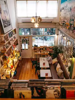 ☕️Very good mood and tone, delicious desserts and drinks. I like that it is a gallery with lots of books, photos, movie posters, records, and collectibles to see, most of which are in foreign languages.