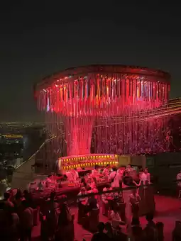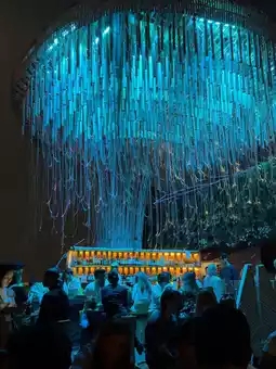* Spectacular Ambiance: The bar's design is its standout feature. Lush greenery and natural materials create an urban jungle feel, culminating in a massive, LED-lit "tree" that serves as the bar's centerpiece. The colorful lights pulse and change, adding a magical and almost Avatar-esque quality to the atmosphere.
