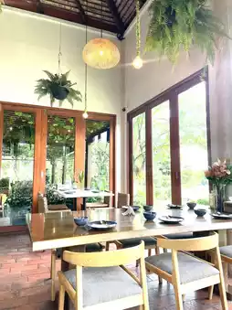 Review: We stayed at a hotel near the airport and saw a cafe near Suvarnabhumi Airport so we decided to give it a try. It's a beautiful cafe with delicious food and lots of places to take pictures. What we liked was that the shop was decorated so cutely. There were flowers on every table and lots of corners for taking pictures. There were both tables inside and outside. The prices of the food weren't too high. Drinks start at 100 baht and cakes start at 100฿, but we liked the sugar palm cake - it was delicious. Food starts at 150฿. Most of the food is Thai food.