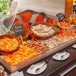 Sashimi and sushi, grilled river prawns, seafood on ice