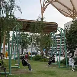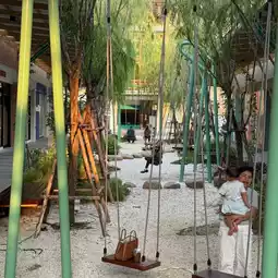 Unexpected surprises await inside the mall, like small bridges and flowing streams that create a relaxing atmosphere. Swinging on swings and riding wooden horses bring back childhood joy in an instant. Surrounded by lush greenery, it feels like an oasis in the city. It's the perfect spot to rest and recharge after a day of shopping.