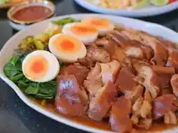 🐷 Krua Luang Pork Leg Rice Set (490 baht): Very large pork leg, meat, skin, eggs, full options, large plate, served with 2 cups of rice and spicy sauce