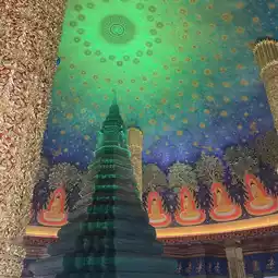 Around the glass spire and across the entire ceiling, beautiful murals depicting the universe and the Buddhist world spread out, creating a mysterious space that will make you sigh in surprise.