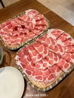 • Buta Signature Set: Pork set for 2-3 people, priced at 999 baht, consisting of 2 large trays of sliced pork (choose between pork neck or pork belly), vegetable set, udon noodles, and 2 eggs.