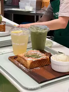 The shop is open-air with a lot of seats, more than 10 tables. The recommended menu is toast or toast. We ordered Uji Matcha Ken Toast for 165.-, a good size toast topped with matcha ice cream. The toast dough is quite crispy. I really wish there was more butter on the inside of the bread.