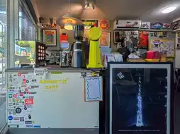 A compact, high-quality specialty coffee cafe with a simple atmosphere. The owner is friendly and full of a sense of unique interests with style, especially pop culture and vintage collectibles. The coffee ordering corner is in front of the shop, decorated with a lot of collectibles such as figures, vintage toys, cards, toys, comic books, vinyl records, art posters, retro wall decorations, and Interstellar movie posters. 😁