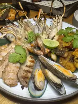 🦐 Fresh seafood: Grilled river prawns, giant crab legs, lobster with seafood sauce and cocktail sauce