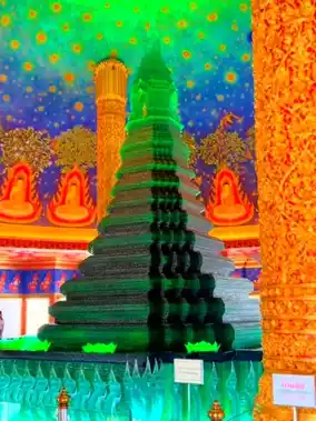💎 The glass stupa inside the chedi – glowing green, surrounded by cosmic murals