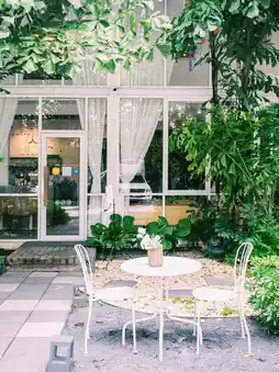 • The cafe offers both indoor and outdoor seating areas surrounded by greenery and large trees for a refreshing ambiance.