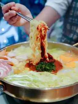 •Original Budae Jjigae, a very rich Korean hot pot, with a slight spiciness from gochujang.