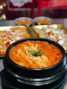 •Soft tofu kimchi soup, rich flavor, served with stewed pork bones.