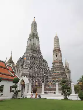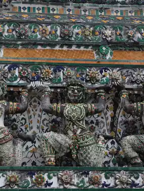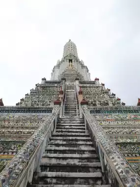 One of Thailand's three major temples, known in Japan as the Temple of Dawn. The white pagoda, when viewed up close, is surprisingly colorful and adorned with intricate decorations.
