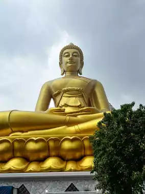 Outside, there is a massive golden Buddha statue standing 69 meters tall ✨. The statue is in a meditative pose 🧘.