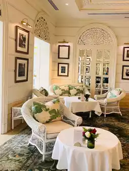 Bathed in natural light, the lounge is decked in pure white with soft green plants, lacy curtains, and vintage charm. It feels like a scene from a classic novel or a graceful afternoon in colonial Asia.
