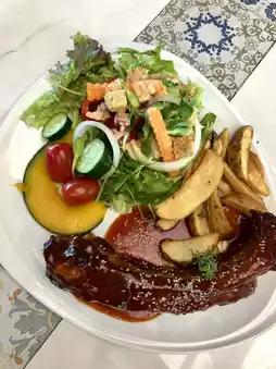✨ Curved Bridge Rib Steak (L) – Grilled pork ribs with barbecue sauce, large plate, rich flavor
