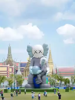 The first time in Thailand! With world-class art, this time KAWS brings a giant COMPANION, 18 meters tall, sitting and hugging the world with the moon, and also a small COMPANION sitting on his lap, super cute, invading the Sanam Luang area, the greatest that has never been seen before in Thailand, from May 13-25, 2025. Small tips for those who will go to see KAWS at Sanam Luang. The most beautiful time of the day is 18.00-19.00 because it is the time when the sun sets. The lights of Wat Phra Kaew will start to turn on around 18.30 and the globe lights that KAWS is holding will turn on at 18.50. If you go during this time, you will be able to see the view both during the day and at night 👍🏻