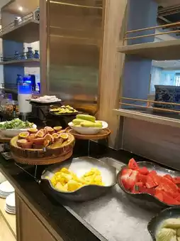 For desserts, there are sweet pastries, waffles, and various types of cakes. There are also various types of fruits. It is considered a very satisfying breakfast. I must say that I did not finish it all because there was so much food that I could not eat it all.
