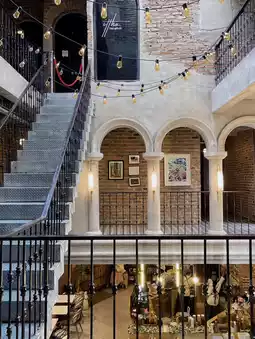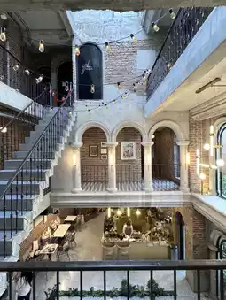 The European-style round arch on the second floor, the paintings of different styles on the wall, the ancient European-style open-air balcony, and the beautiful lighting really make it a great photo.