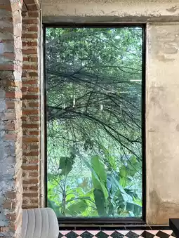 #BangkokShoppingGuide A garden cafe hidden in the old city of Bangkok, a small white building surrounded by green willows, away from the bustling city center, hidden in the alley, specializing in coffee and Western food