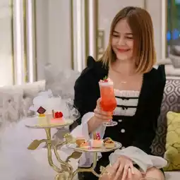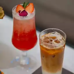 For tea lovers, we recommend Tropical Wonderland, a caffeine-free blended tea mixed with butterfly pea flowers Dried coconut, bael fruit and pandan leaves, naturally sweet from stevia, drinking it with the dessert in the set is very good, perfect combination.