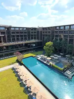 Despite its proximity to the airport, the hotel offers a tranquil, tropical resort-like atmosphere, creating a relaxing paradise.