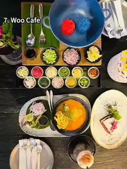 ✨Highlights: This artsy cafe is not only visually stunning but also offers creative dishes! Their two-tone rice, dyed naturally with butterfly pea and dragon fruit, is vibrant and served with a variety of toppings like corn, green peas, chili, and coconut shreds. Mix and match for a layered, refreshing flavor.