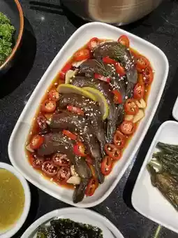 🥓 Pork Neck – pork neck marinated in Korean sauce, grilled to a delicious aroma, served with a variety of side dishes