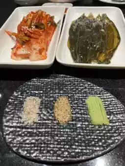 A wide selection of side dishes including fresh kimchi, pickled kimchi, pickled sesame leaves, scallion salad, and various dipping sauces such as salt, pepper, wasabi, and gochujang