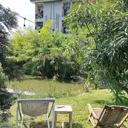 clay wood studio is a hidden gem in Srinakarin that feels like being in Chiang Mai, with a very shady and peaceful café. This adorable studio café has a great atmosphere and also offers ceramic wheel-throwing workshops. Its distinctive feature is a simple two-story wooden house surrounded by lush greenery, creating a very relaxing vibe. The drink menu includes both coffee and non-coffee options, all in one place, and the flavors are delicious too. Definitely not to be missed!
