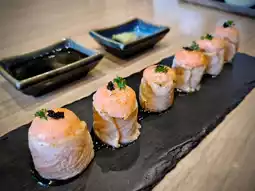 🍣 Aburi Salmon Roll – flame-seared salmon roll topped with mayo sauce, mentaiko, and tobiko, perfectly completing the flavor.