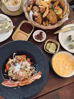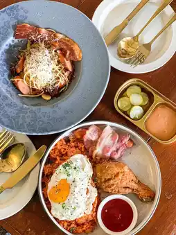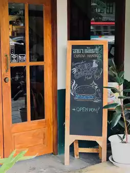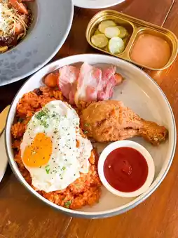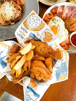 Chayaa Mansri Fried Chicken: The shop serves American-style fried chicken, fragrant with spices, juicy inside, and very crispy batter. Besides that, they also have burgers with homemade buns, salads, mashed potatoes, and pasta. Warning‼️ The chicken pieces here are huge. We ordered 6 pieces thinking they would be small, but they were actually huge. In the photo, they look like regular small pieces 🤣 When we saw the real ones, we could only wrap them to go because we couldn't finish them 😂