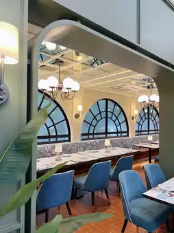 A beautiful glasshouse-style restaurant with high ceilings, warm mint green tones, 2 floors, comfortable seating, spacious area, and plenty of photo corners in every nook and cranny.