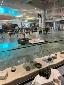 An underground cafe with a unique style and a chill atmosphere, featuring a pop art gallery corner and fantasy paintings.