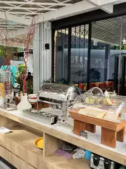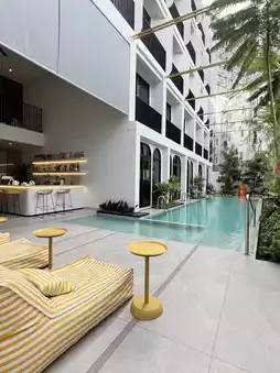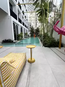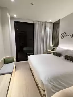 It’s near the Airport Rail Link Ratchaprarop station, but the surrounding area is currently under construction, and the road conditions are poor, so it will be tough if you’re dragging luggage! The hotel is brand new with modern facilities, the public areas have a stylish design, and the rooms are Japanese minimalist style. The mattress provides good support, medium firmness—very comfortable. Breakfast is a special offer at 150 THB, also minimalist style (not many dishes XD). There are also three rooms on the first floor with direct access to the pool 🎉