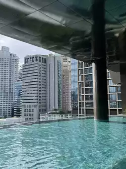 The pool, situated on a middle floor of the hotel, offers a quiet and relaxing atmosphere despite being in the city center. The view of Bangkok from the high floor is stunning, and the well-arranged sunbeds give a resort-like feel in the city 🏊♀️🌴