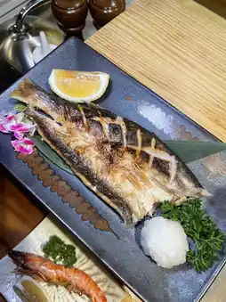 Grilled Amadai fish is fragrant with a slightly salty taste, enjoyed with lemon to balance the flavor—delicious. Grilled Kamasu fish is cooked just right, firm texture, great taste. Grilled shrimp served with mayo sauce and lemon. Slow-cooked grilled chicken and pork are favorites—super delicious. The chicken skin is crispy, the inside tender and juicy. The pork is very tender, served with onion sauce that pairs perfectly.