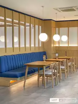 The cafe is decorated perfectly with blue and cream colors accented by wood, complemented by glass walls all around that let in natural light, making photos look amazing.