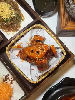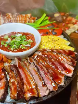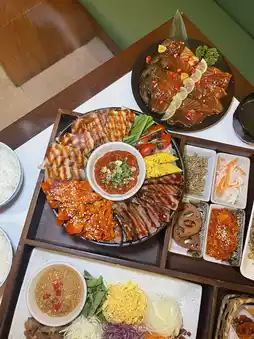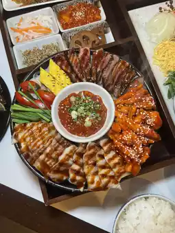• Korean BBQ Traditional Jeongchan — A set of 3 kinds of Korean grilled meat served on a grill, enjoyed with fresh vegetables and various side dishes. Everything tastes great together.