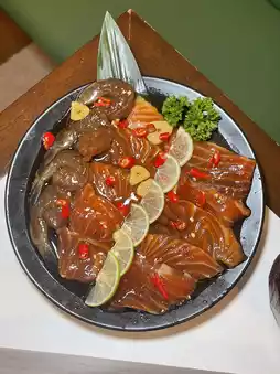 • Soy Sauce Marinated Salmon & Shrimp — Salmon and shrimp marinated in soy sauce, with a sweet and salty flavor and a strong soy aroma. Not fishy at all. Great as a snack or with hot rice.