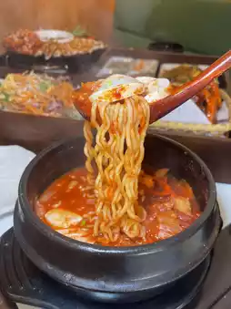 • Traditional Ramen Kimchi Jjigae With Pork Belly — Korean instant noodles in kimchi soup, served with pork belly, tofu, and egg. Delicious and perfect for sipping the broth.
