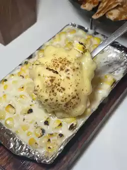 • Double Corn Cheese — Corn cheese served in a hot pan with melty cheese, perfect as a snack.