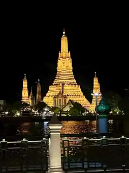 A beautiful temple by the Chao Phraya River with a tall, stunning pagoda adorned with colorful tile patterns. The peaceful atmosphere is ideal for watching the sunset and capturing river views.