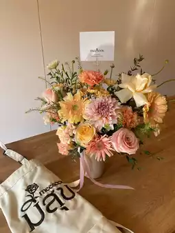 A short walk from MRT Sanam Chai Exit 4, crossing Khlong Lot Bridge, you’ll find "Meesook" on Atsadang Road (near the well-known Farm to Table). Just seeing the storefront already radiates warmth. The shop is a small shophouse decorated adorably with a minimalist style but full of charming details. As soon as you open the door, a gentle floral scent greets you. The atmosphere inside is wonderful! The lighting is just right, and the flowers and decorations are neatly arranged, making you feel completely relaxed and at ease.