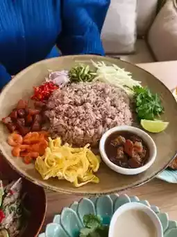 ✅ Mackerel fish chili paste - smooth, balanced flavor, perfect with fresh veggies ✅ Stir-fried green roselle with chili - a unique but amazing dish! Crispy roselle stir-fried with fresh chili and fragrant garlic 🌶️ ✅ Sweet sun-dried mackerel - crispy fried mackerel, truly hard to find 🐟 ✅ Mackerel in soy sauce stew - tender, fragrant fish, loved it ✅ Grilled beef salad with Thai eggplant - fragrant grilled beef with spicy salad dressing ✅ Coconut milk rice noodles - a sweet, traditional dish with a lovely aroma ✅ Sour curry with shrimp and papaya - bold flavors typical of sour curry ✅ Rice mixed with shrimp paste - fragrant and delicious, never boring 🍚 ✅ Roselle and chrysanthemum drinks - very refreshing, served with ice balls ✅ Crispy ruby and taro dumplings - homemade desserts, soft and delicious, you’ll want seconds 🍡