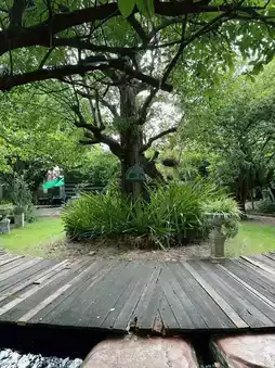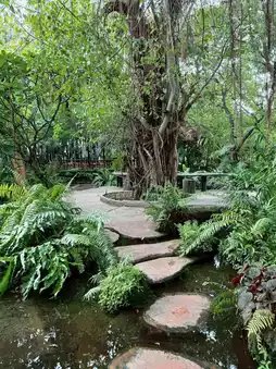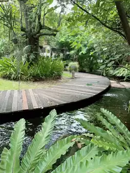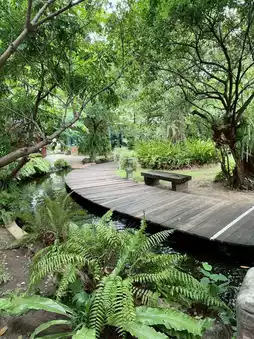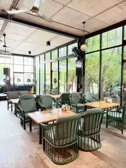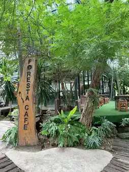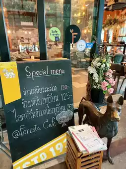 a cafe located not far from Don Mueang Airport. Here at Foresta Cafe, you will find the natural shade of various trees, a koi pond, a turtle pond, and many seating areas to choose from, both outdoor and indoor. We chose to sit inside. The menu here is very diverse, including both savory and sweet dishes, as well as tea and coffee drinks—everything is available. This meal, we chose to have desserts. The dishes we ordered were black sesame rice balls in ginger syrup and honey toast with chocolate and vanilla ice cream. The food tastes really good. The black sesame rice balls in ginger syrup are well made with a mellow flavor. The honey toast took about 20 minutes to prepare; the outside is crispy, and the inside is soft. It’s delicious.