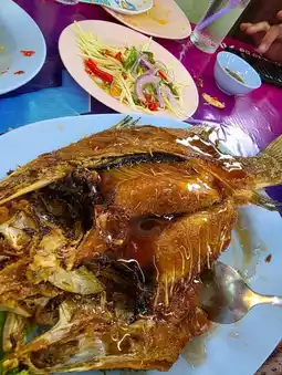 Fried Sea Bass with Fish Sauce – crispy outside, tender inside, not greasy, topped with fragrant fish sauce and perfect when dipped in mango salad.